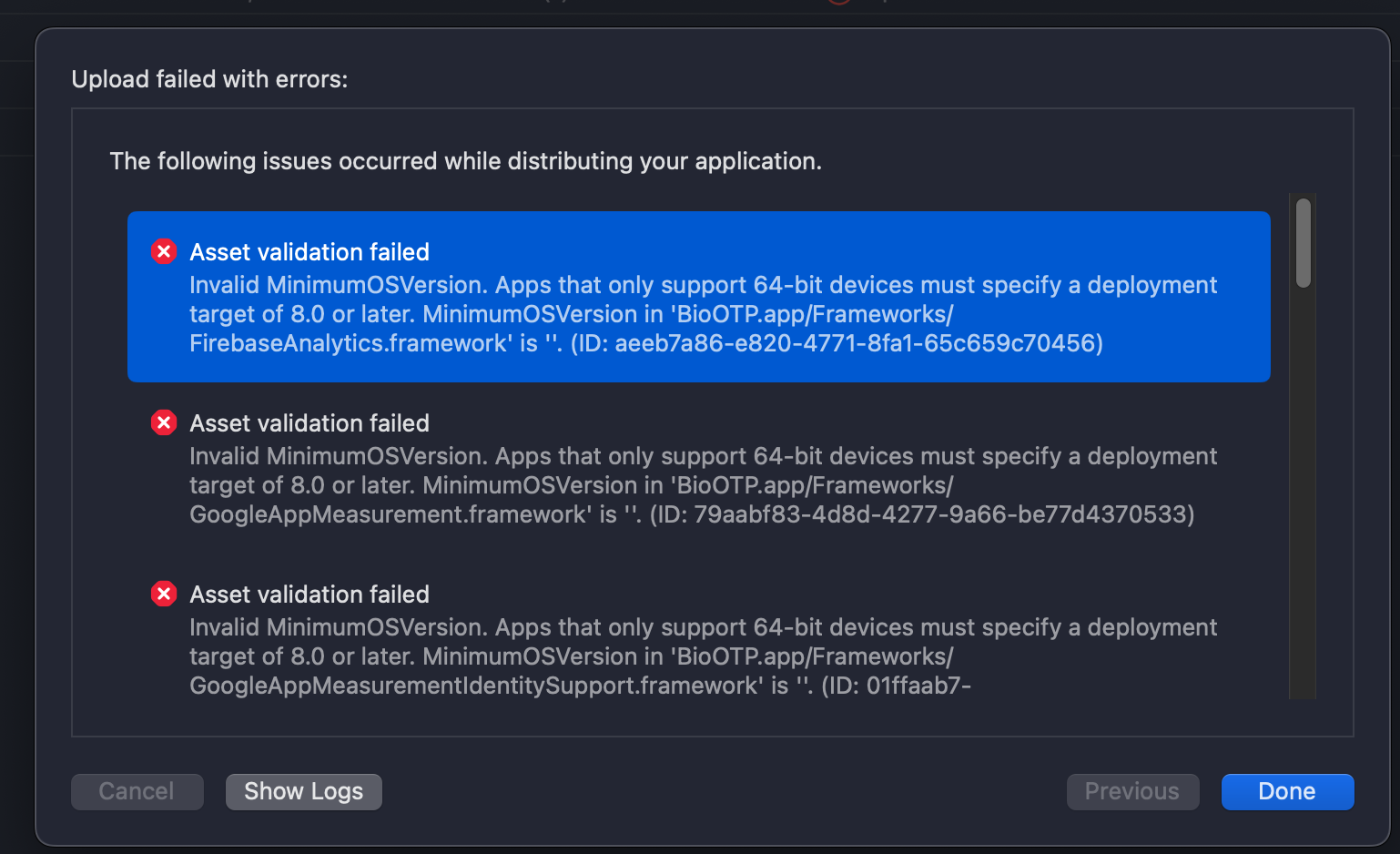 [ERROR]Invalid MinimumOSVerisionFirebase Framework 에러 발생 개발 환경Xcode - 15.3.0 몇 개월 만에 프로젝트를 열어 Archive 하였더니 에러 발생현재 Xcode 15.3 버전에서 개발하고 아래와 같은 오류가 발생했다. ⛔️ 에러 내용 ⛔️ Asset validation failed Invalid MinimimOSVersion. Apps that only support 64-bit devices must specify a deployment target of 8.0 or later. MinimumOSVersion in '~/Frameworks/FirebaseAnalytics.framework' 🌏 번역 🌏: 최소 OS 버전이 ..